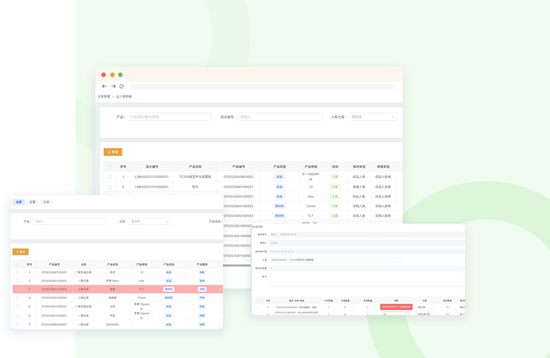 采购入库、常规入库、调拨入库、生产入库、销售出库、常规出库、调拨出库、领料出库一个也不能少,数据联动流转判定,库存不足自动预警