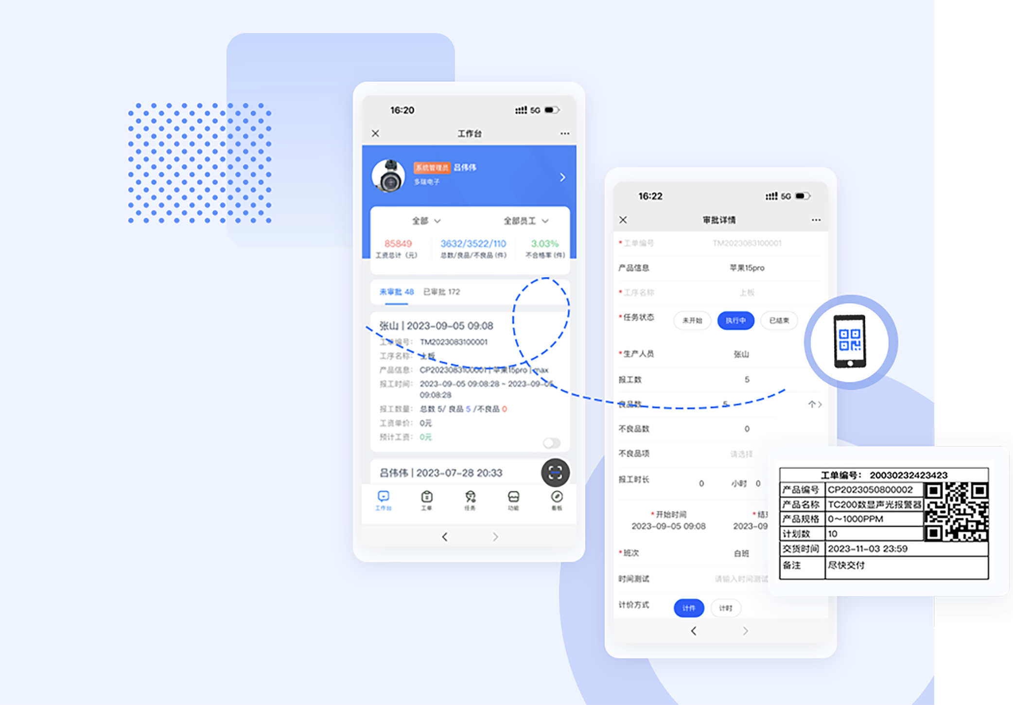 随时随地使用手机微信扫码报工,操作简单,工人实时上报工作情况,自动核算计件计时工资,避免手工核算易错性